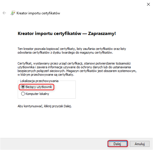 4. W otwartym kreatorze importu certyfikatów jako lokalizację przechowywania wybrać Bieżący użytkownik i przejść Dalej.