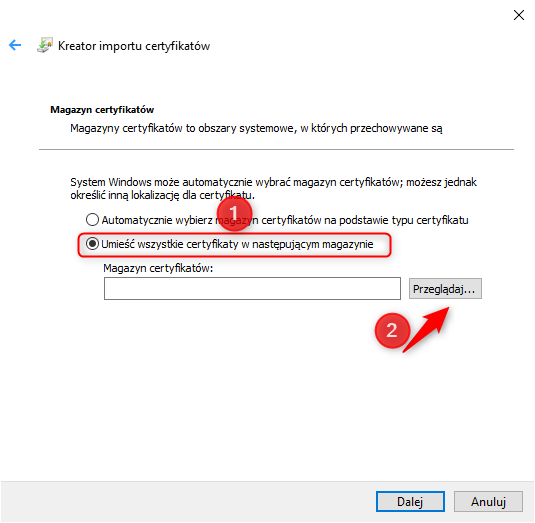 5. Zaznaczyć opcję Umieść wszystkie certyfikaty w następującym magazynie i wcisnąć Przeglądaj​.