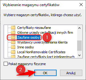 6. Z listy dostępnych magazynów certyfikatów odszukać i zaznaczyć magazyn Zaufane osoby, po czym zatwierdzić wybór przyciskiem OK.
