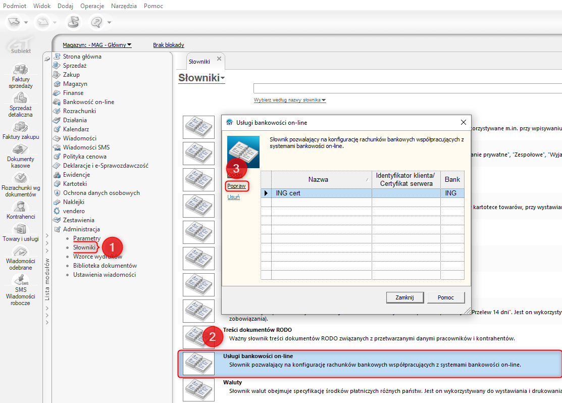 8. W programie linii GT przejść do modułu AdministracjaSłowniki –​ Usługi bankowości online i poprawić obecną konfigurację.