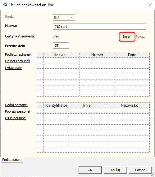 10. W nowym oknie kliknąć Zmień certyfikat, a następnie z listy wybrać aktualny certyfikat ING Bussines WebService.