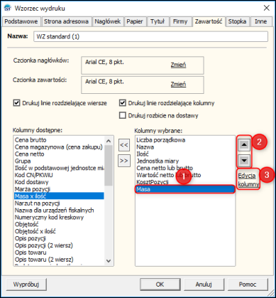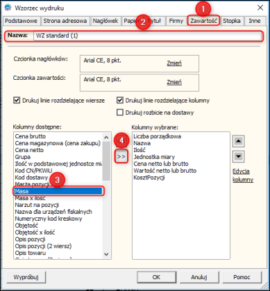 2. Wprowadzić Nazwę nowego wzorca wydruku, przejść na zakładkę Zawartość, w sekcji Kolumny dostępne zaznaczyć kolumnęMasa i umieścić kolumnę w sekcji Kolumny wybrane używając szarej strzałki skierowanej w prawo.