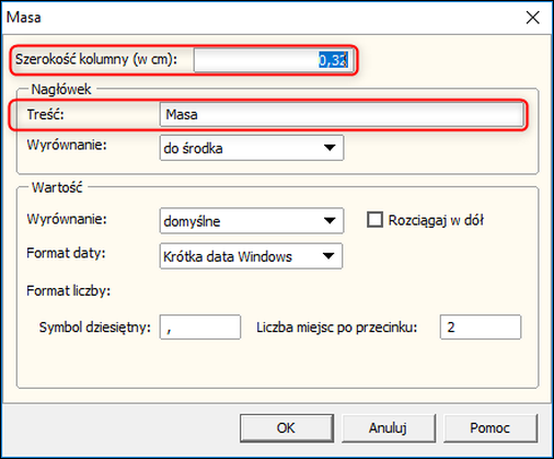 4. W następnym oknie warto ustawić Szerokość kolumny (powinna być ustawiona indywidualnie względem długości wartości kolumny) oraz Treść nagłówka. Po wprowadzeniu tych danych zarówno ustawienia kolumny, jak i sam wzorzec wydruku zapisać przyciskiem OK.