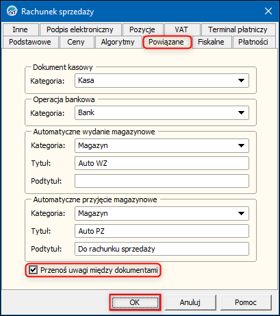 Subiekt GT – Jak włączyć przenoszenie uwag między rachunkiem sprzedaży a dokumentami z nim powiązanymi?