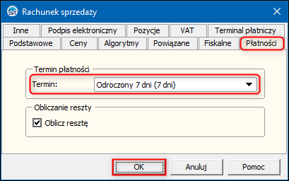 2. W oknie, które się wyświetli przejść na zakładkę Płatności i wybrać domyślny Termin. Jeżeli potrzebnego terminu nie ma na liście, należy go dodać w programie. Temat e-Pomocy technicznej opisujący, jak dodać termin płatności dostępny jest tutaj​. Zmiany zapisać przyciskiem OK.