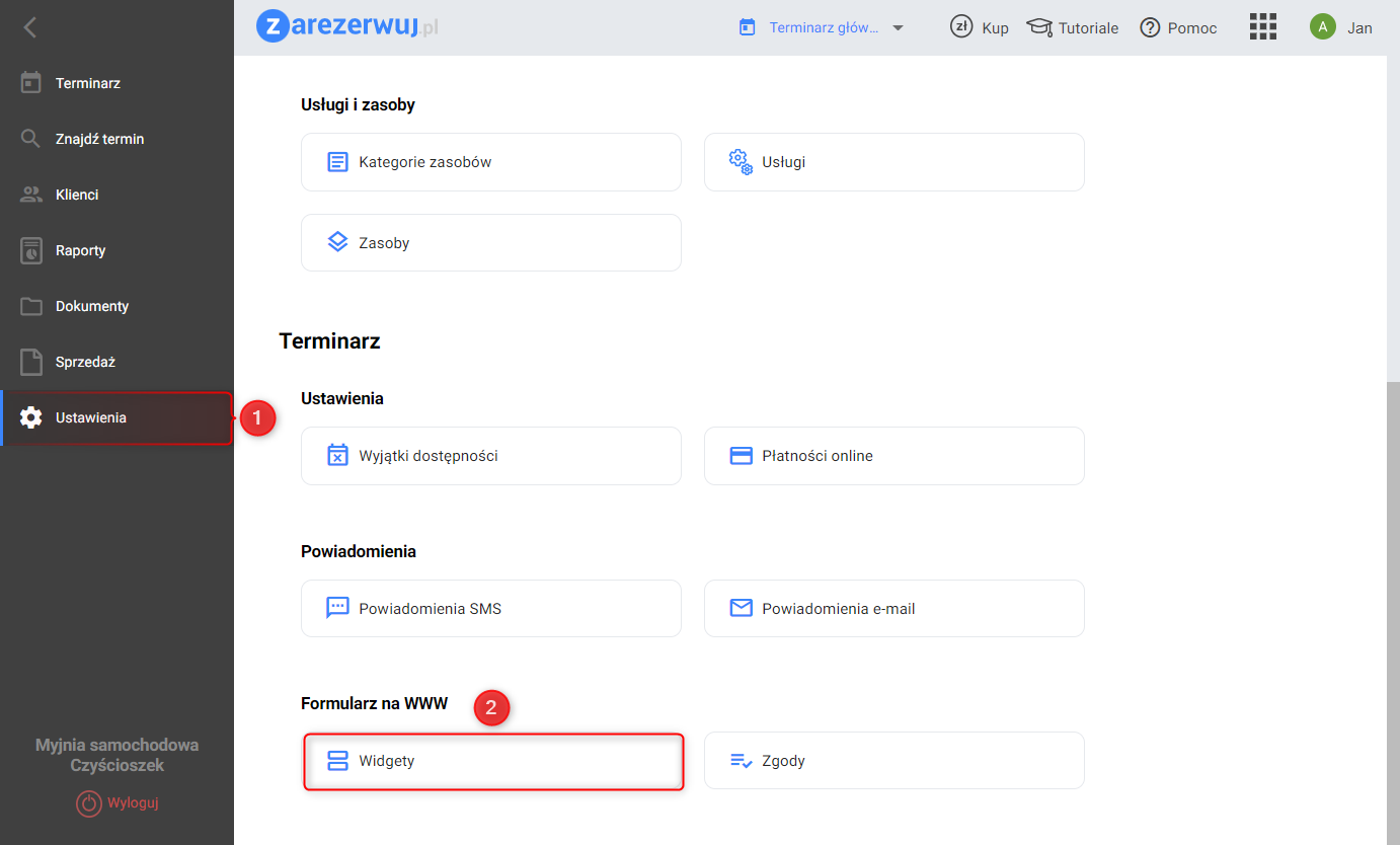 1. Przejść do menu Ustawienia – Widgety w sekcji Formularz na www.