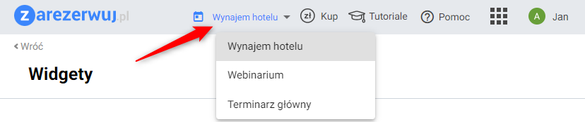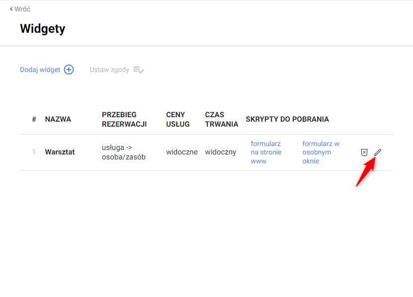 2. Kliknąć ikonę "ołówka", znajdującą się przy Widgecie. W przypadku braku wcześniej utworzonego formularza rezerwacji www kliknąć Dodaj widget.