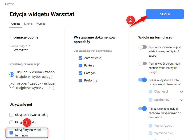 Aplikacja zarezerwuj.pl umożliwia klientom rezerwację usług z wykorzystaniem formularza na stronie www lub w nowym oknie. Podczas tworzenia formularza, użytkownik ma możliwość ukrycia pól związanych z filtrowaniem widoku terminów. W tym celu należy: