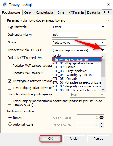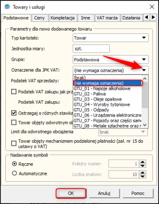 Aby przypisać domyślne oznaczenie dla JPK_VAT mające zastosowanie w nowo dodawanych kartotekach asortymentowych  jako "nie wymaga oznaczenia" należy: