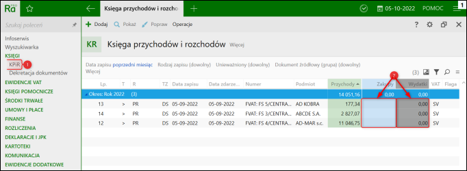 Program Rachmistrz nexo pozwala na pominięcie wartości zerowych w kolumnach KPiR. Przykładowo, na poniższym zrzucie ekranu funkcja ta została zastosowana dla kolumny Zakupy, natomiast dla kolumny Wydatki zachowano ustawienia domyślne.