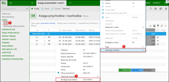 1. Przejść do modułu KPiR, kliknąć Prawym przyciskiem myszy na liście, wybrać Operacje na liście – Konfiguracja widoku.