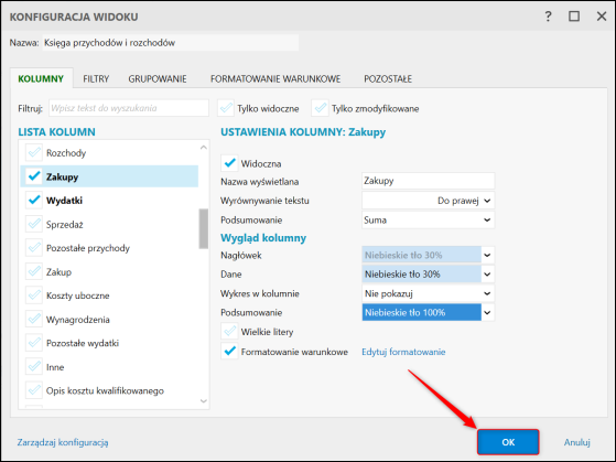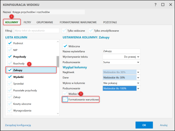 2. Na zakładce Kolumny z listy kolumn wybrać edytowaną pozycję i zaznaczyć Formatowanie warunkowe.