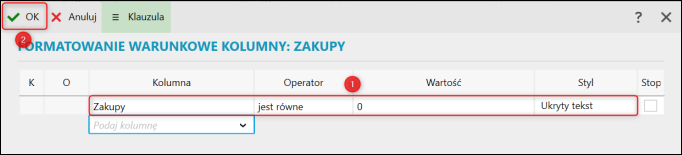 3. Dodać formatowanie warunkowe. W tym przypadku, jeżeli wartość w kolumnie Zakupy będzie równa 0, to program ukryje tekst. Zatwierdzić przyciskiem OK.
