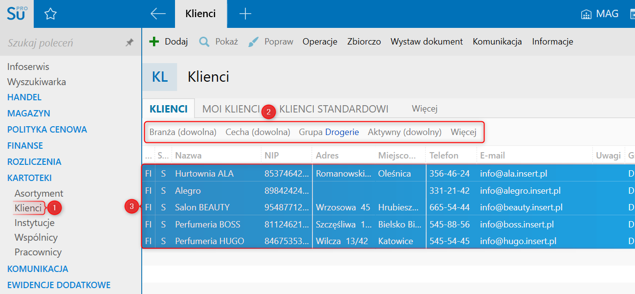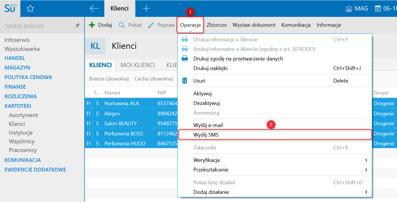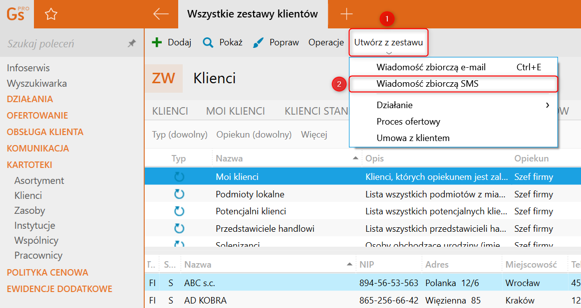 Kategoria: Klienci, Operacje zbiorcze, Wiadomości SMS