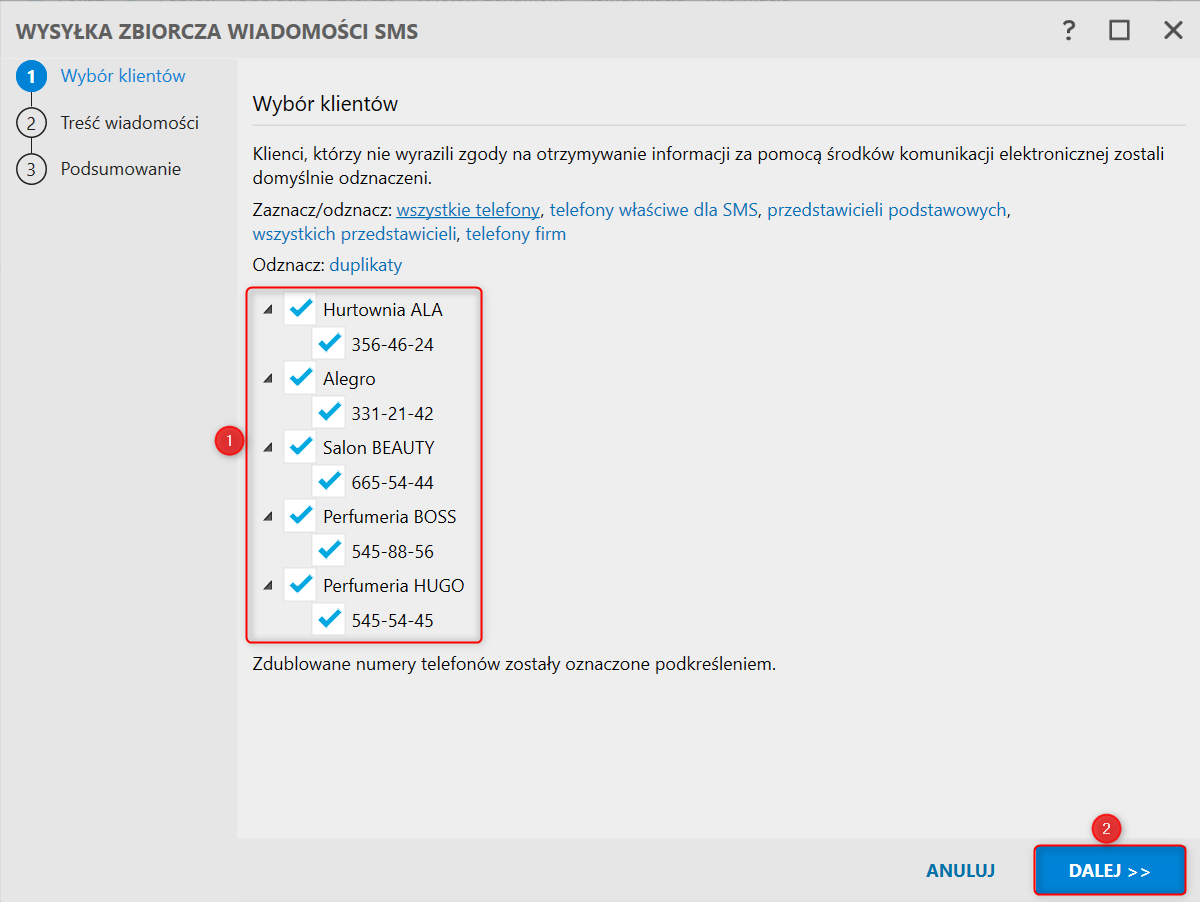 3. Zaznaczyć odbiorców wiadomości i kliknąć Dalej.