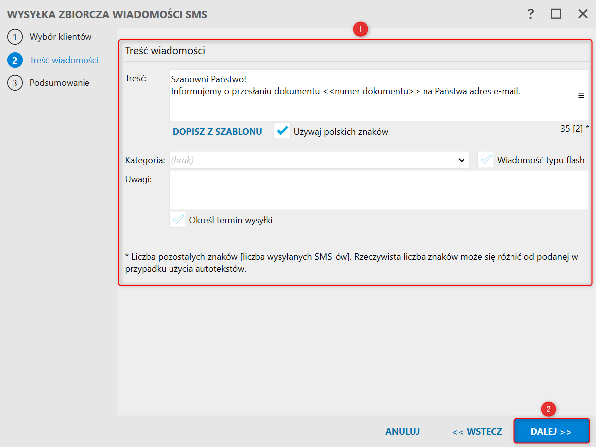 4. Określić Treść oraz pozostałe parametry związane z wiadomością. Przejść Dalej.