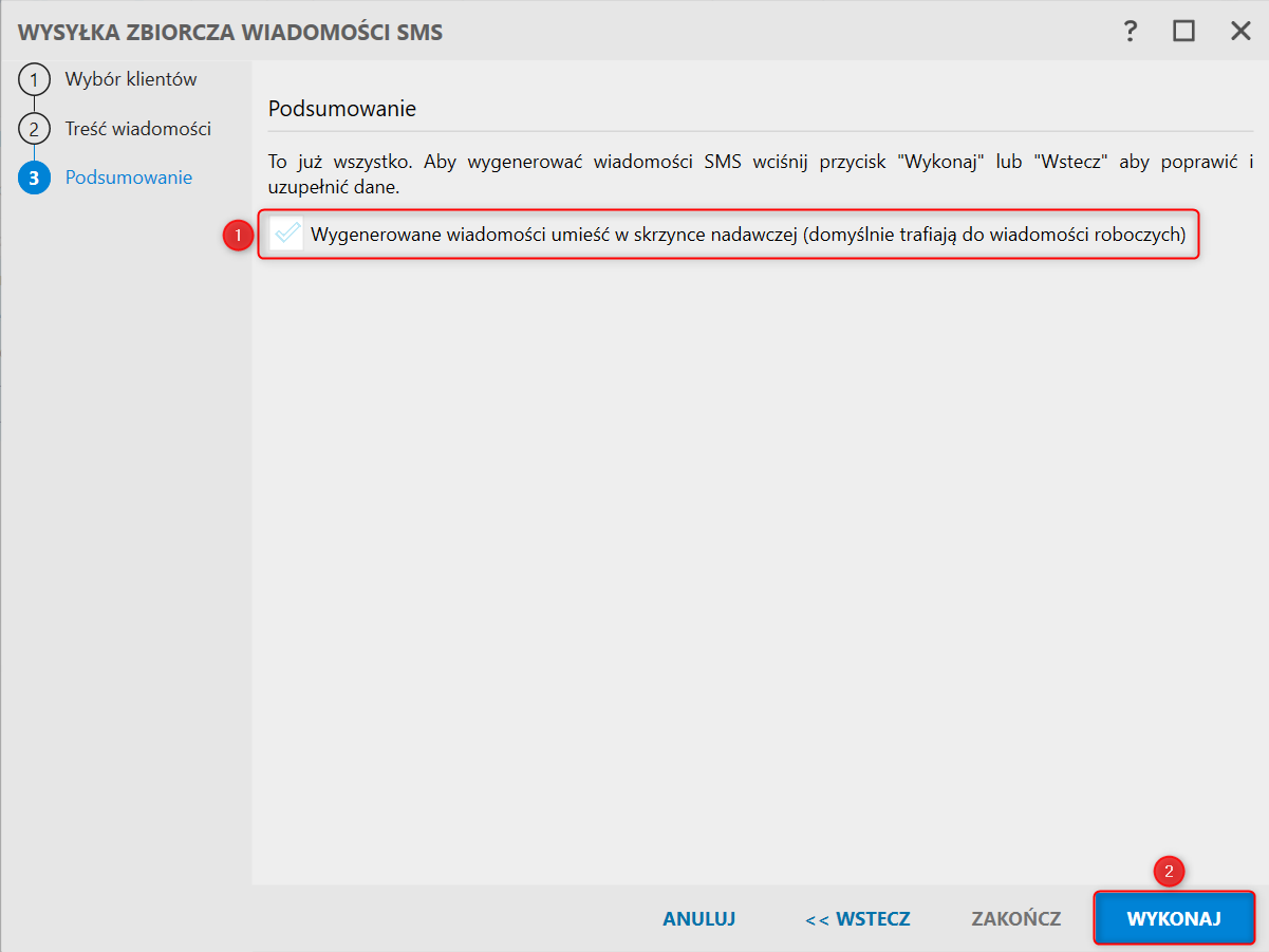 5. Zdecydować, gdzie powinny trafić wygenerowane wiadomości i zatwierdzić przyciskiem Wykonaj, a później Zakończ.