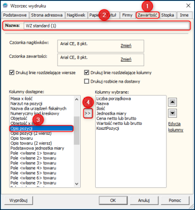 2. Wprowadzić Nazwę nowego wzorca wydruku, przejść na zakładkę Zawartość, w sekcji Kolumny dostępne zaznaczyć kolumnęOpis pozycji i umieścić kolumnę w sekcji Kolumny wybrane używając szarej strzałki skierowanej w prawo.