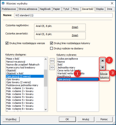 3. Kiedy kolumna znajduje się w sekcji Kolumny wybrane, można ustalić jej położenie względem innych kolumn. W tym celu należy zaznaczyć kolumnę i posłużyć się strzałkami skierowanymi w górę i w dół. Po ustaleniu kolejności drukowanych kolumn przy zaznaczonym polu własnym kliknąć Edycja.