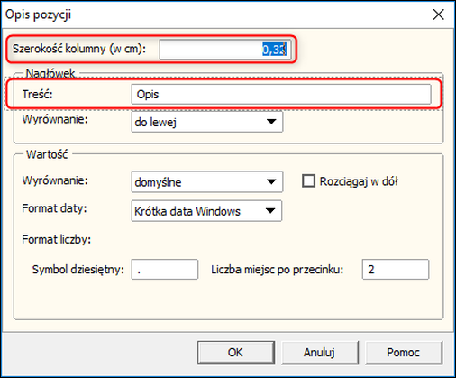 4. W następnym oknie warto ustawić Szerokość kolumny (powinna być ustawiona indywidualnie względem długości wartości kolumny) oraz Treść nagłówka. Po wprowadzeniu tych danych zarówno ustawienia kolumny jak i sam wzorzec wydruku zapisać przyciskiem OK.