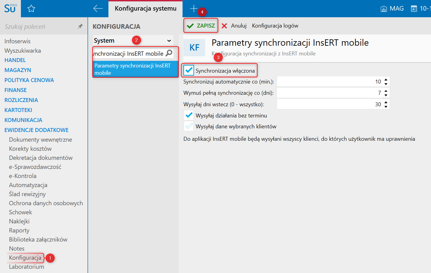 Insert nexo – Parametry synchronizacji InsERT mobile