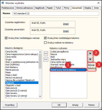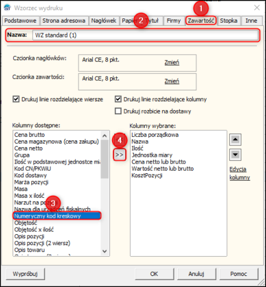 2. Wprowadzić Nazwę nowego wzorca wydruku, przejść na zakładkę Zawartość, w sekcji Kolumny dostępne zaznaczyć kolumnęNumeryczny kod kreskowy i umieścić kolumnę w sekcji Kolumny wybrane używając szarej strzałki skierowanej w prawo.