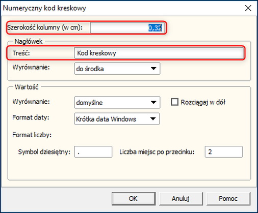 4. W następnym oknie warto ustawić Szerokość kolumny (powinna być ustawiona indywidualnie względem długości wartości kolumny) oraz Treść nagłówka. Po wprowadzeniu tych danych zarówno ustawienia kolumny jak i sam wzorzec wydruku zapisać przyciskiem OK.