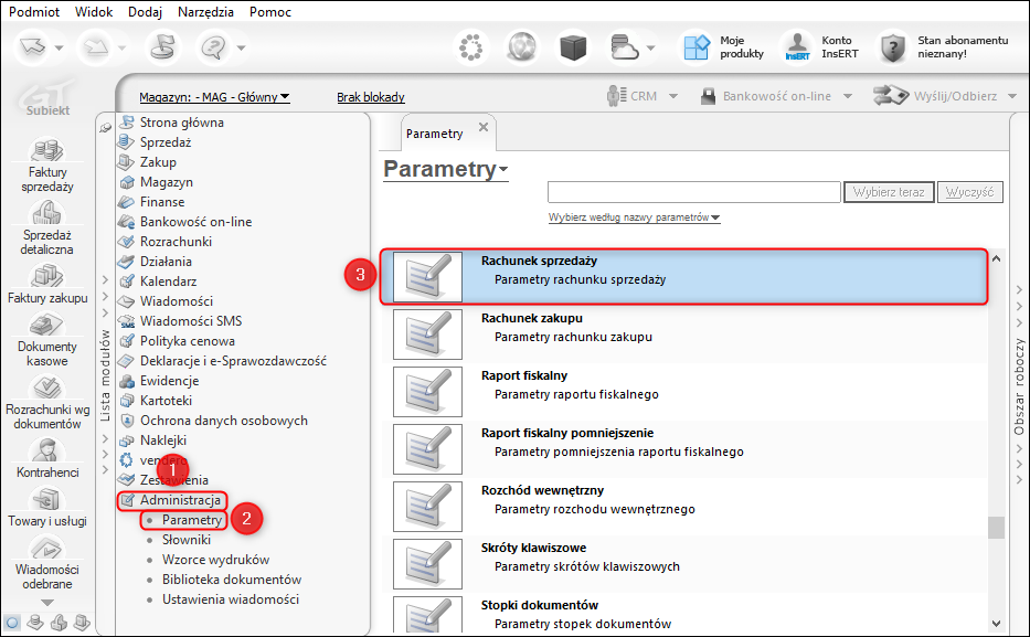 1. Z listy modułów wybrać Administracja – Parametry, a z listy parametrów Rachunek sprzedaży.