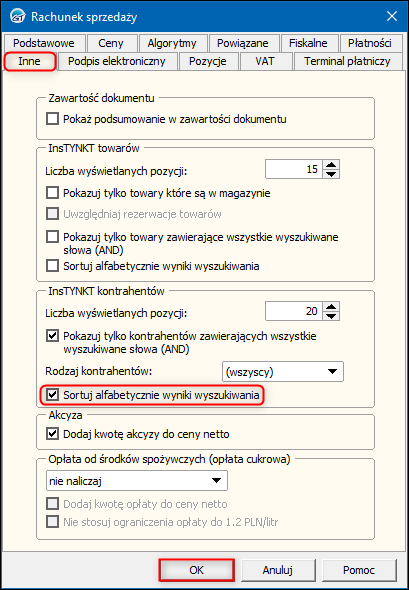 2. W oknie Rachunek sprzedaży przejść na zakładkę Inne i zaznaczyć opcję Sortuj alfabetycznie wyniki wyszukiwania w sekcji InsTYNKT kontrahentów. Zmiany zapisać przyciskiem OK.