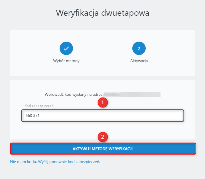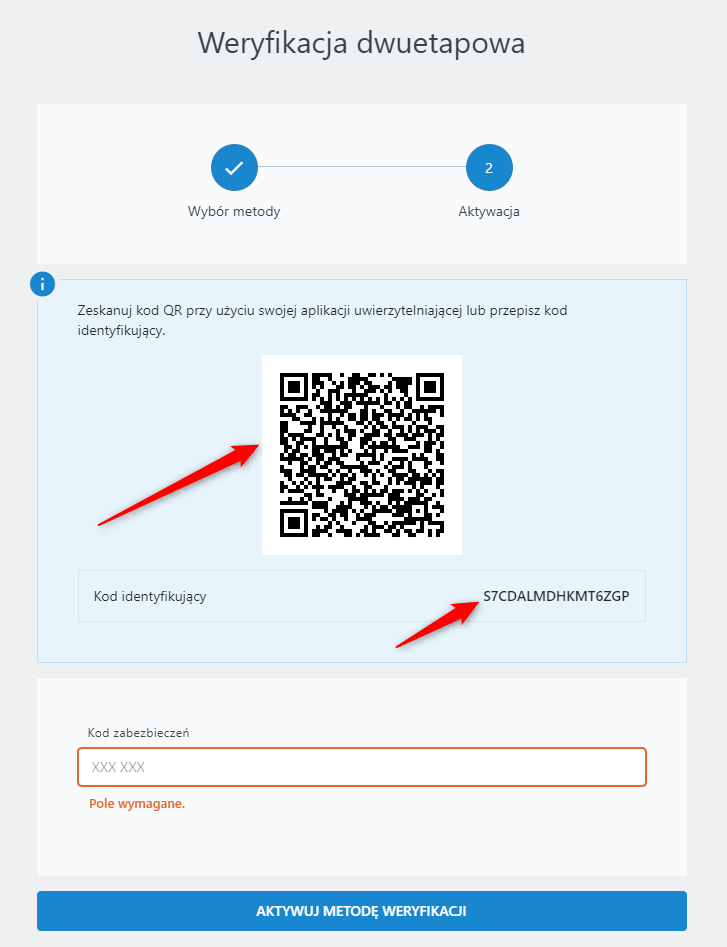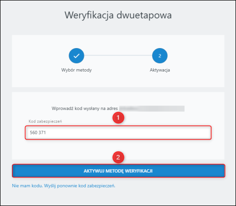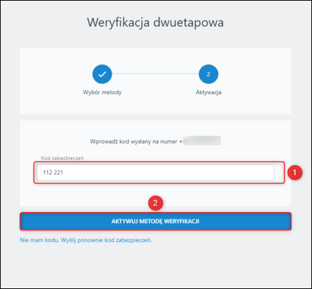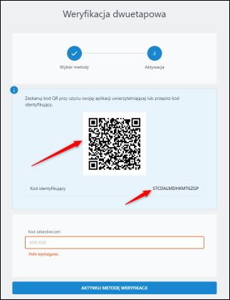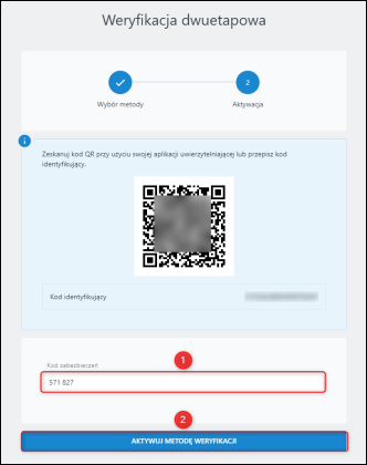 Wpisać kod z aplikacji do pola Kod zabezpieczeń. Kliknąć Aktywuj metodę weryfikacji.