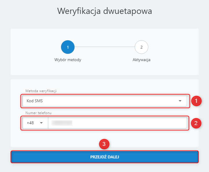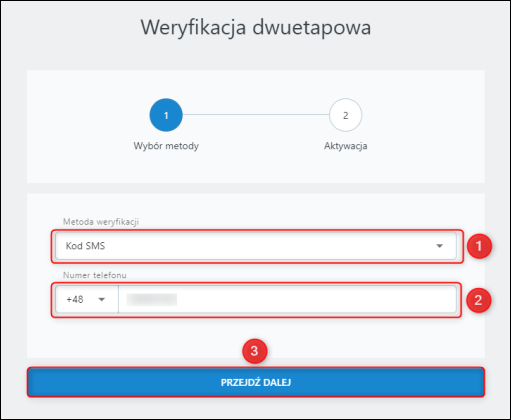 W polu Metoda weryfikacji wybrać: Kod SMS, uzupełnić numer telefonu komórkowego. Kliknąć Przejdź dalej.