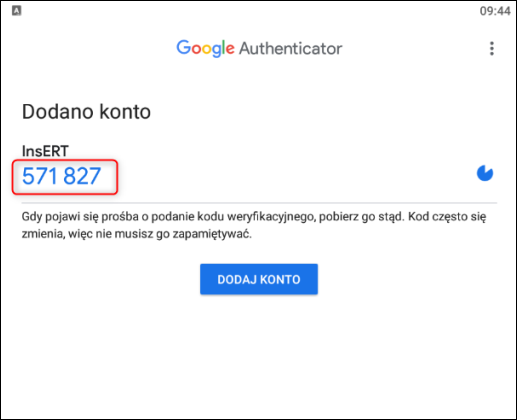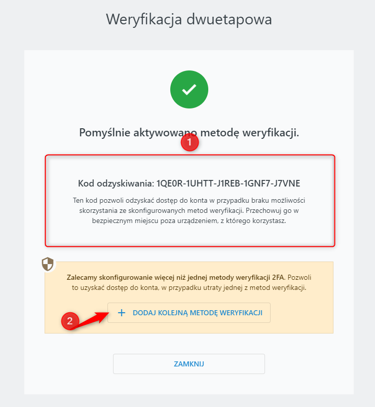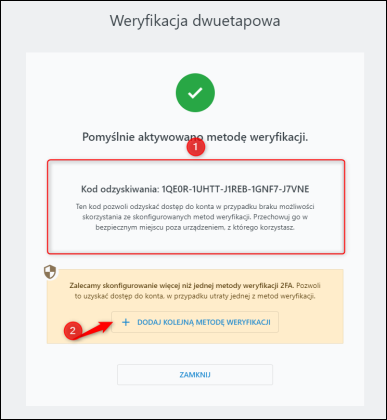 Po pomyślnym dodaniu metody weryfikacji wyświetli się stosowny komunikat oraz kod odzyskiwania.