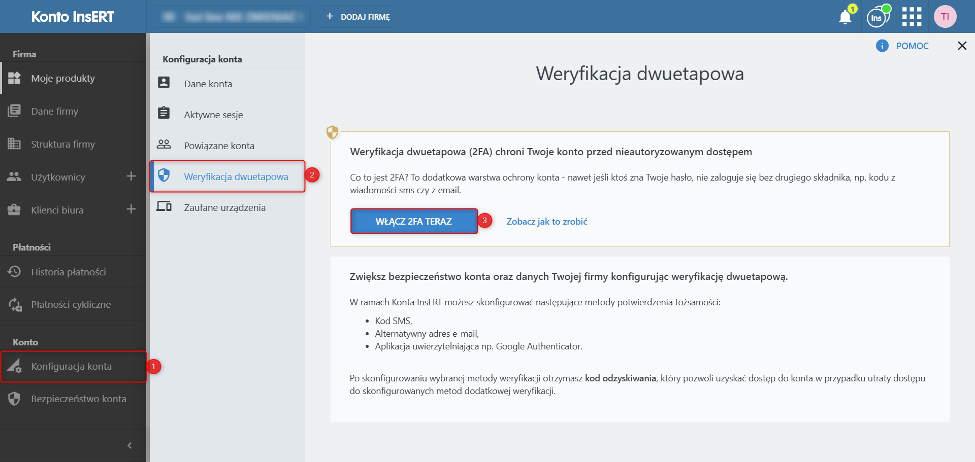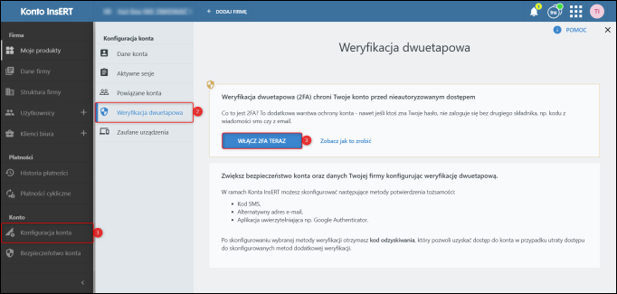 W celu włączenia weryfikacji dwuetapowej (2FA) w ramach Konta InsERT, należy: