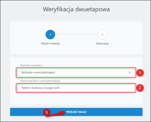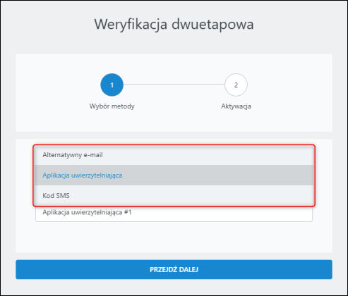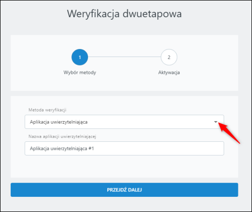 W polu Metoda weryfikacji wybrać: Aplikacja uwierzytelniająca, w polu Nazwa aplikacji uwierzytelniającej wpisać tekst według własnych preferencji. Kliknąć Przejdź dalej.