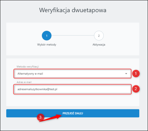 W polu Metoda weryfikacji wybrać: Alternatywny e-mail, uzupełnić adres e-mail. Kliknąć Przejdź dalej.