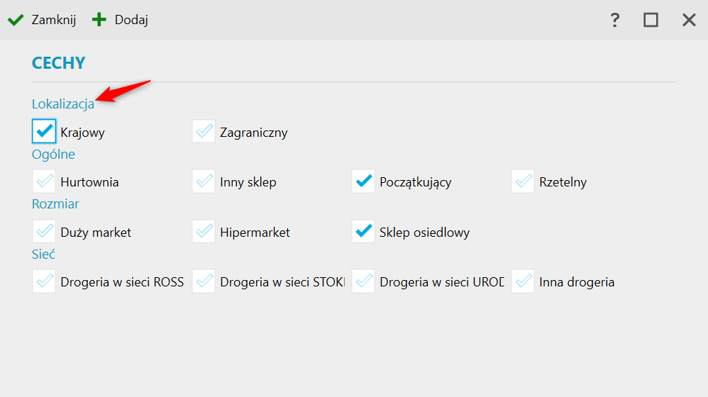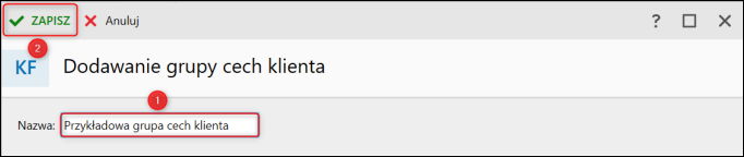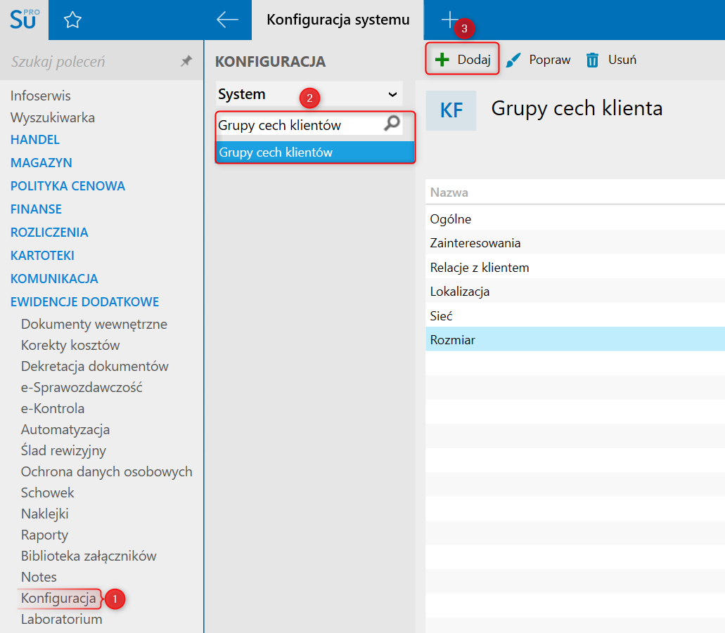 1. Przejść do modułu Konfiguracja, odszukać i kliknąć Grupy cech klientów, po czym wcisnąć przycisk Dodaj.