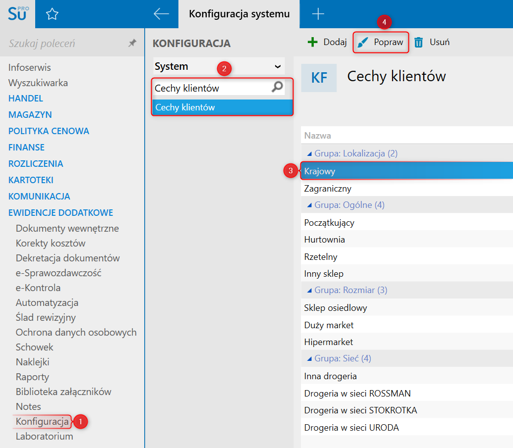 1. Przejść do modułu Konfiguracja, odszukać i kliknąć Cechy klientów​, zaznaczyć pozycję na liście i wybrać Popraw.