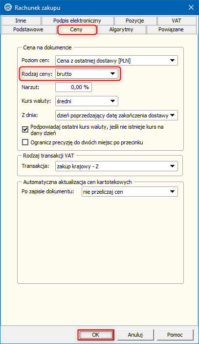 Subiekt GT – Jak ustawić domyślny rodzaj ceny rachunku zakupu?