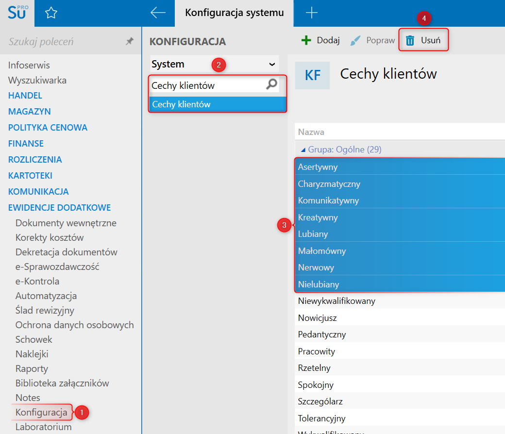 1. Przejść do modułu Konfiguracja, odszukać i kliknąć Cechy klientów​, zaznaczyć jedną lub wiele pozycji na liście i wybrać Popraw.