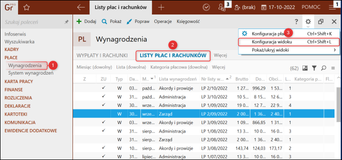 1. Przejść do modułu Wynagrodzenia – Lista płac i rachunków. Następnie w prawym górnym rogu, kliknąć "zębatkę" i wybrać Konfiguracja widoku.