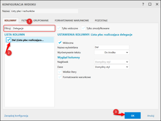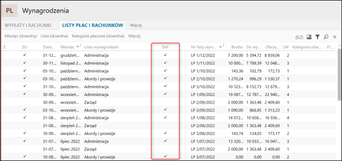 W widoku Listy płac i rachunków pojawi się nowa kolumna Del.