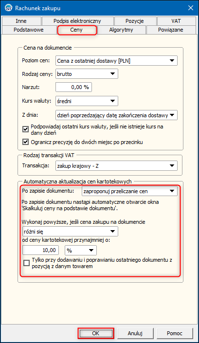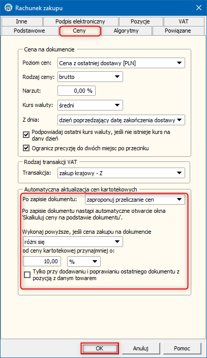 • automatycznie przelicz ceny – opcja ta spowoduje, że przeliczanie cen nastąpi w pełni automatycznie. Cena kartotekowa zostanie zastąpiona ceną z dokumentu​