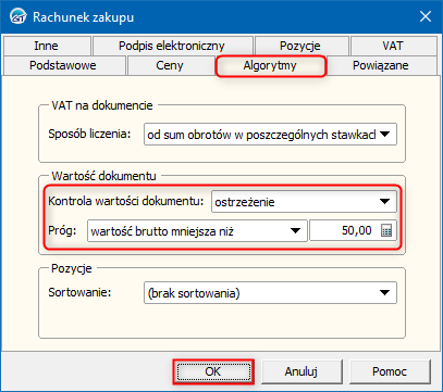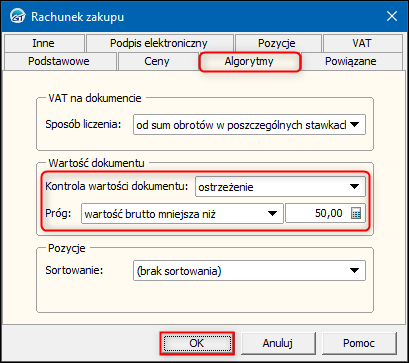 2. W oknie, które się wyświetli przejść na zakładkę Algorytmy i dokonać ustawień w sekcji Wartość dokumentu. Wskazać sposób kontroli wartości (ostrzeżenie, które pozwala zapisać dokument lub blokada zapisu) i ustawić Próg. Zmiany zapisać przyciskiem OK.