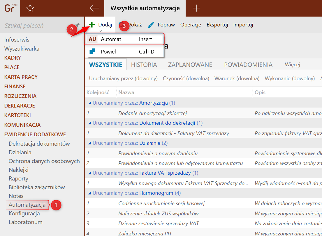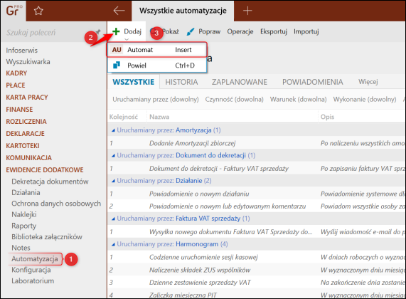 1. Przejść do modułu Ewidencje dodatkowe – Automatyzacja i kliknąć Dodaj – Automat.