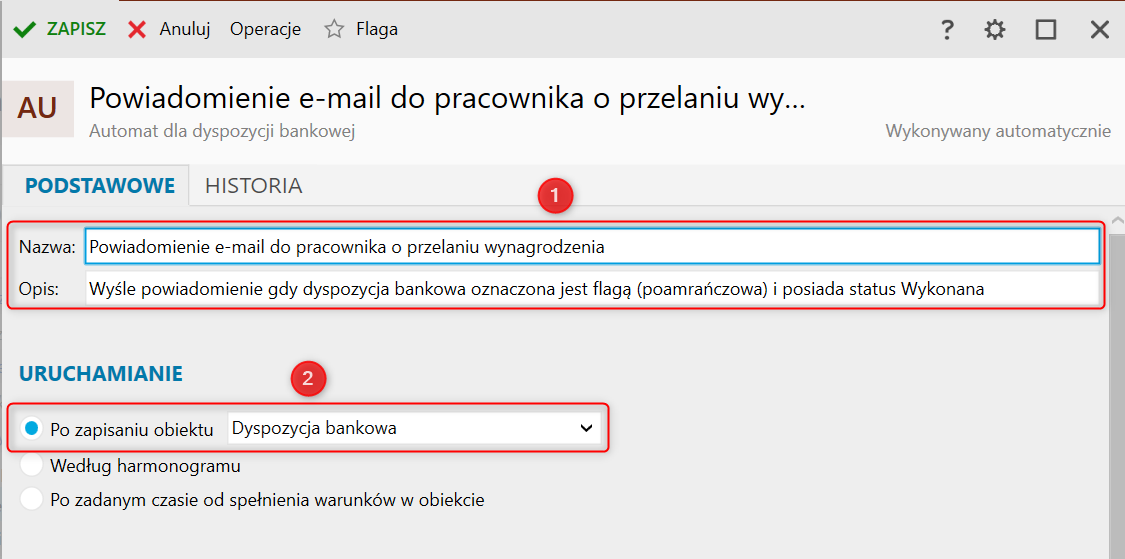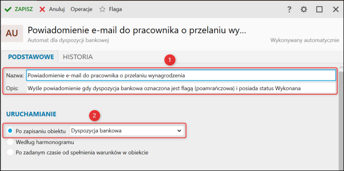2. Nadać nazwę automatu i wprowadzić moment uruchamiania obiektu: Po zapisaniu obiektu – Dyspozycja bankowa.