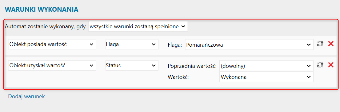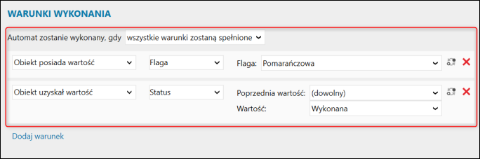 3. W sekcji Warunki wykonania wybrać Automat zostanie wykonany gdy – wszystkie warunki zostaną spełnione.