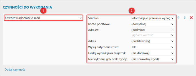 4. Jako Czynności do wykonania wprowadzić Utwórz wiadomość e-mail. Następnie uzupełnić pozostałe pola: