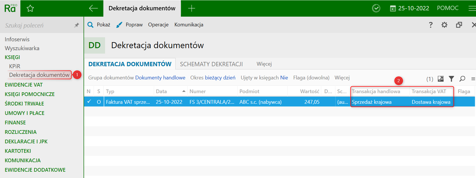 Programy Rachmistrz nexo i Rewizor nexo pozwalają na przyporządkowanie zdefiniowanych transakcji VAT do transakcji handlowych dostępnych na dokumentach w Subiekcie nexo. Przykładowo, dla Faktury sprzedaży, dla której Transakcja handlowa została określona jako Sprzedaż krajowa, automatycznie została nadana Transakcja VAT – Dostawa krajowa.