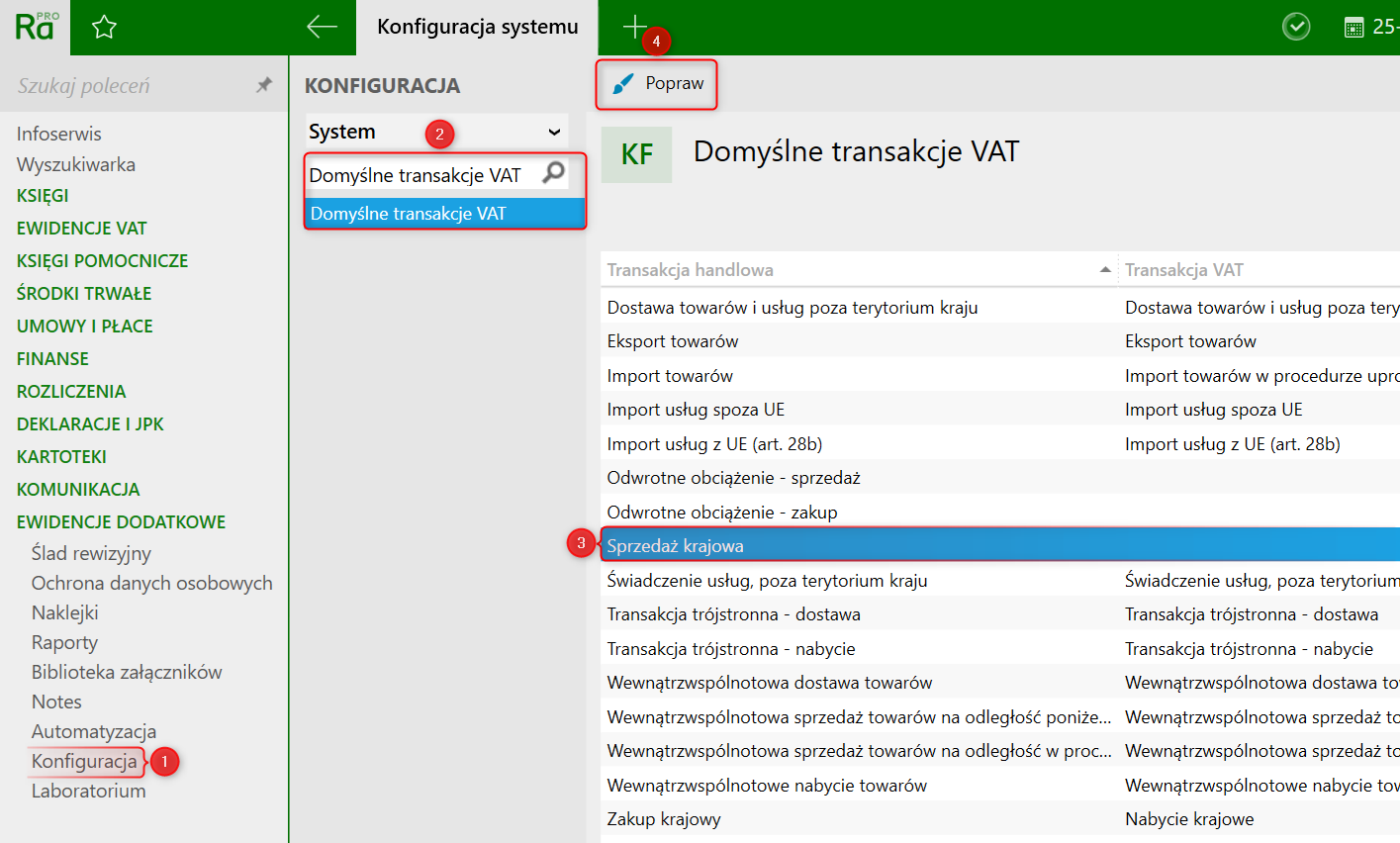 1. Przejść do modułu Konfiguracja, odszukać i kliknąć Domyślne transakcje VAT, zaznaczyć pozycje na liście i wybrać Popraw.