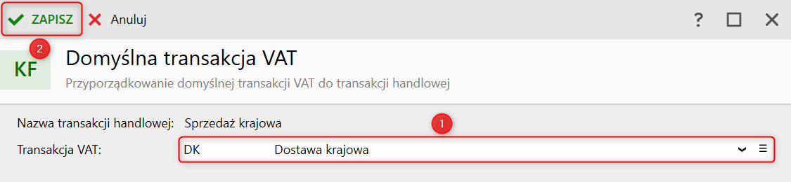 2. Wybrać Transakcję VAT i zatwierdzić przyciskiem Zapisz.